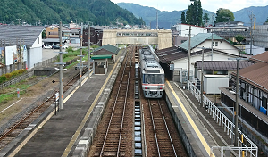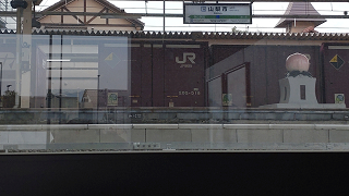 (あおやぎ) JR東日本 中央本線 『咲-Saki-』第10話 21世紀になってから建て替えられた駅舎は、"うだつ"をモチーフに したおされ(笑)なデザイン。JR東日本はこういうの多い気が…(汗)。 走っている車両は何故か飯田線のものなので、アニメスタッフ(※ 原作には登場しない)がこの駅を選んだのは単に見栄えの問題? |