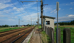 (きりはら) 長野電鉄 長野線 『ツルネ -風舞高校弓道部-』OP 上り(長野方面行き)ホームより撮影。以前は駅舎と繋がる下りホームから 跨線橋を渡る必要がありましたが、無人駅化された現在では直接入れる スロープも設置。写真手前側のベンチは撤去されてしまったようで残念。 ちなみにしな鉄北長野駅から住宅街を抜け徒歩で訪れることも可能です。 |