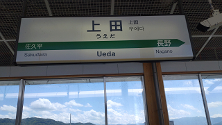 (うえだ) JR東日本 北陸新幹線 『サマーウォーズ』 駅名標からもわかる通り下り(長野方面行)ホームで撮影してますが、 実際のガスタンクは駅から少し離れている為再現は不可能だったり。 しなの鉄道&上田電鉄も乗り入れる当駅ですが、それぞれの改札 のみならず、駅舎内のあちらこちらに設置されている暖簾が印象的。 |