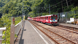 (ながしまダム) 大井川鐵道 井川線 『ゆるキャン△SEASON3』第4話 隣のアプトいちしろ駅から当駅までが(現在は)日本唯一のアプト式区間で、 補助電気機関車はこの区間を行ったり来たりしてたり。駅名通り長島ダム 最寄り駅でホームからも雄大な姿が眺められますが、筆者が訪問した数日 前に周辺でクマ目撃情報があった為(滝汗)、散策路は閉鎖されてました。 |