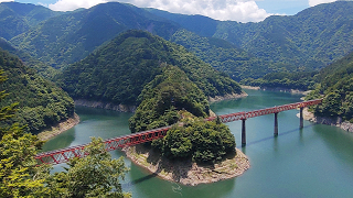 (おくおおいこじょう) 大井川鐵道 井川線 『ゆるキャン△SEASON3』第4話 長島ダム湖に架かる鉄橋(レインボーブリッジ)の真ん中に位置する秘境駅。 鉄橋の井川方面(写真左)側には歩道も併設されていて、更にその端から 急な階段及び山道を経由すると(この写真を撮影出来る)展望所に辿り着く。 近年は奥大井"恋錠"駅の愛称が付けられその手の施設が増殖中(苦笑)。 |
